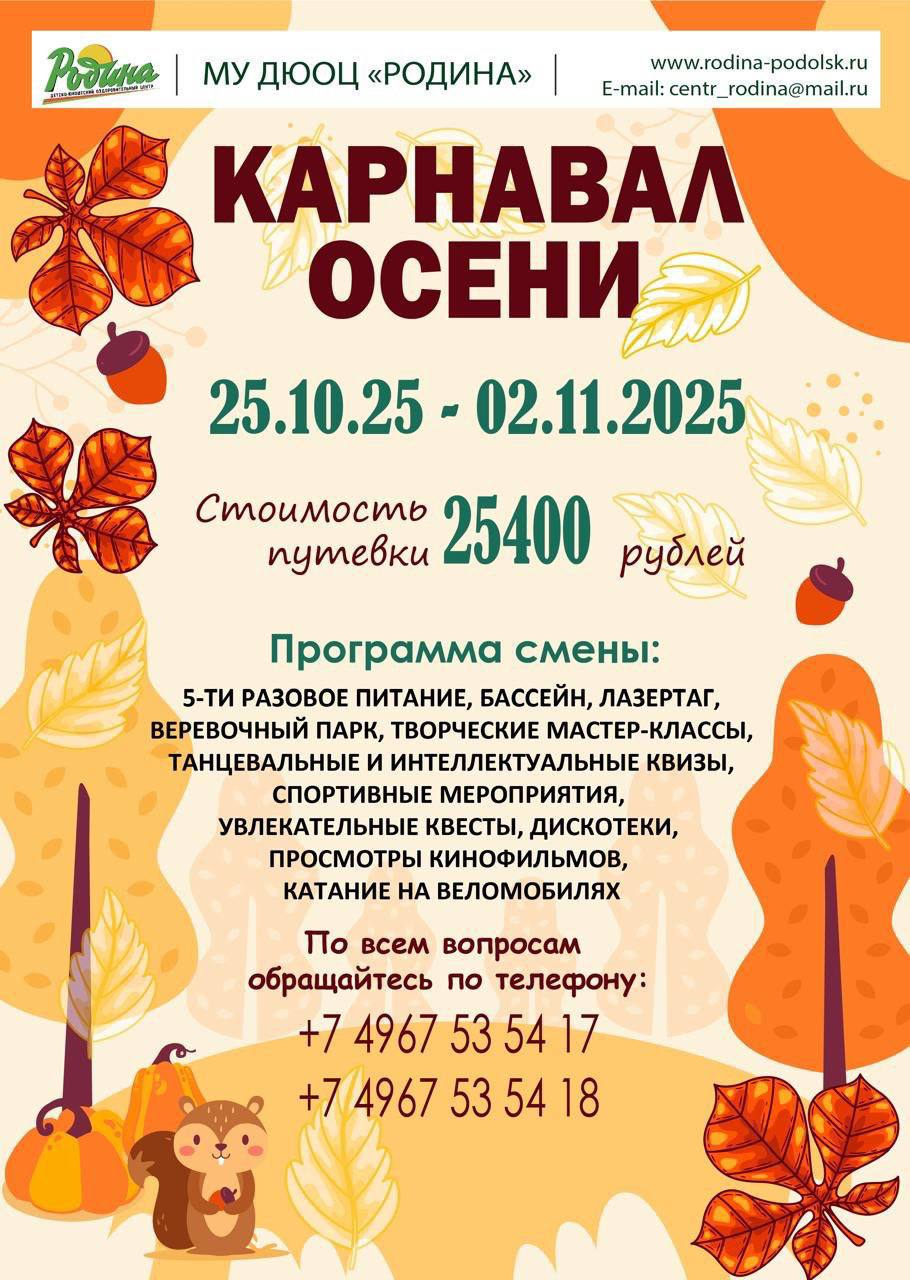 Центр «Родина» уже ждёт Вас на свой осенний заезд «Карнавал осени» с 25.10.2025г. по 02.11.2025г. Мы приглашаем ваших детей окунуться в атмосферу яркого и незабываемого праздника, где каждый день будет наполнен новыми открытиями и приключениями! Наш осенний заезд – это прекрасная возможность для ребят отдохнуть от школьных будней, найти новых друзей и развить свои таланты. В ПРОГРАММЕ: 5-ти разовое питание, бассейн, лазертаг, веревочный парк, творческие мастер-классы, танцевальные и интеллектуальные квизы, спортивные мероприятия, увлекательные квесты, дискотеки, просмотр кинофильмов, катание на веломобилях. Мы гарантируем безопасность и комфорт для каждого ребенка. С нами работают опытные вожатые, которые создадут теплую и дружелюбную атмосферу. Каждый ребенок сможет проявить себя, раскрыть свой творческий потенциал и получить массу положительных эмоций. Не упустите возможность подарить своему ребенку незабываемые осенние каникулы! Количество мест ограничено. Забронируйте путевку прямо сейчас и подарите вашему ребенку праздник! Ждем вас в Центре «Родина»! По всем вопросам обращайтесь по телефону: +7 4967 53 54 17 +7 4967 53 54 18