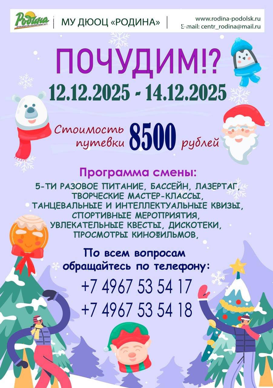 Спешим вам обрадовать, что с 12.12.2025 по 14.12.2025 в центре «Родина» пройдет долгожданный заезд выходного дня «Почудим?». Откройте для своих детей мир зимней сказки и незабываемых приключений! Этот заезд – не просто отдых, это яркий калейдоскоп впечатлений, позволяющий каждому ребенку почувствовать себя особенным и проявить свои таланты. Программа смены разработана с любовью и вниманием к деталям, чтобы подарить юным участникам море позитива и полезных навыков. Нас ждет: 5-ти разовое питание, разработанное с учетом потребностей растущего организма, заряд энергией и бодростью на весь день. Бассейн – это не только возможность поплавать, но и весело провести время с друзьями, участвуя в водных играх и эстафетах. Лазертаг – захватывающая командная игра, развивающая ловкость, стратегическое мышление и умение работать в коллективе. Творческие мастер-классы помогут раскрыть креативный потенциал каждого ребенка, научат создавать прекрасные вещи своими руками и подарят радость самовыражения. Танцевальные и интеллектуальные квизы – это отличный способ развить эрудицию, чувство ритма и просто весело провести время. Спортивные мероприятия – это возможность укрепить здоровье, почувствовать командный дух и научиться достигать поставленных целей. Увлекательные квесты подарят ребятам незабываемые приключения, требующие находчивости, смекалки и умения работать в команде. А завершат каждый день зажигательные дискотеки и уютные просмотры кинофильмов, создавая атмосферу тепла и дружбы. Успейте забронировать места!По всем вопросам обращайтесь по телефонам: +7 4967 53 54 17 +7 4967 53 54 18 Ждём Вас в центре «Родина»!