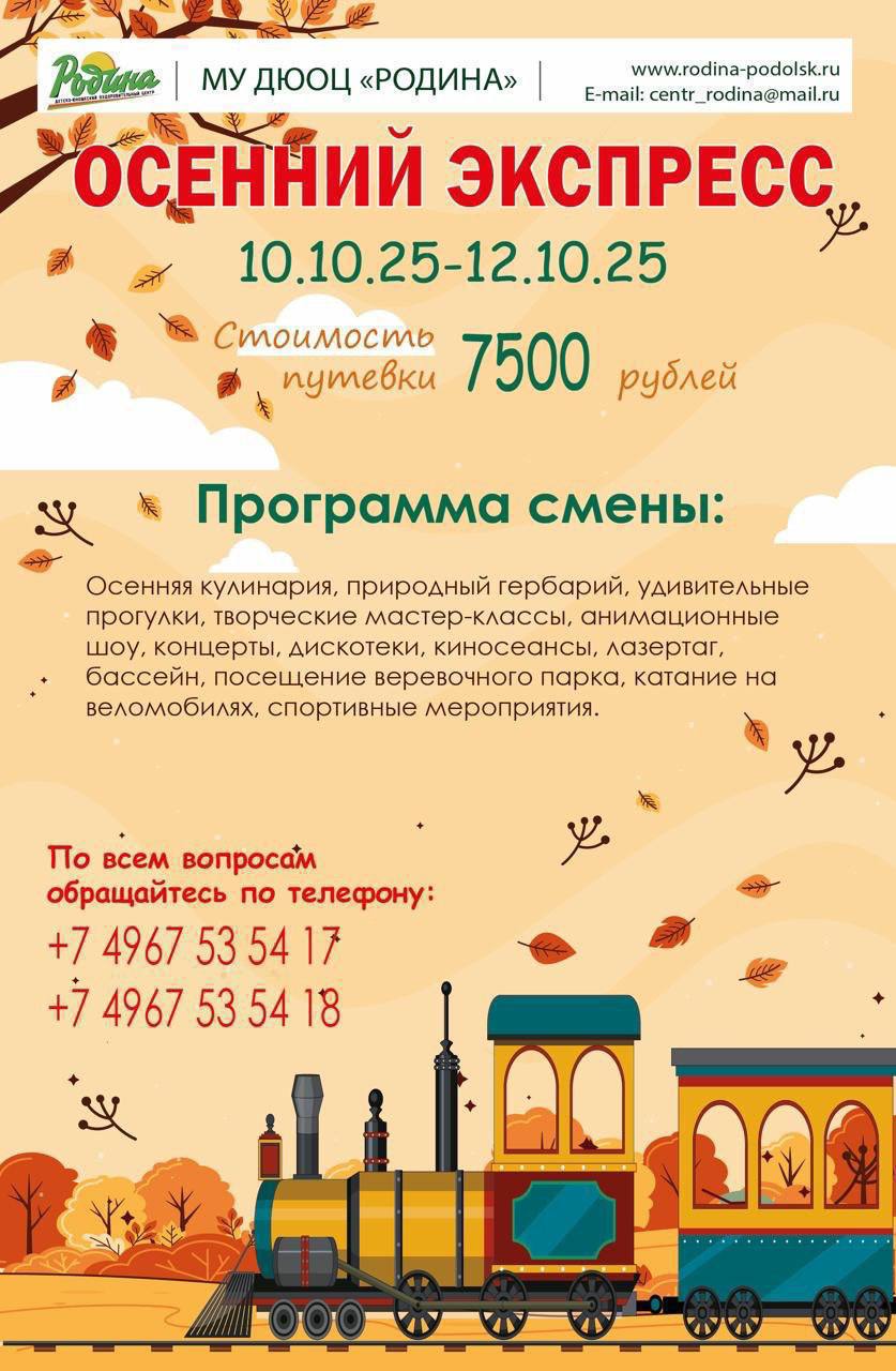 Мы будем ждать детей в центре «РОДИНА» 10 октября с 16.00 до 17.00 по адресу: Московская область, Г.о. Подольск, пос. санатория «Родина», д.9 Выезд детей 12 октября с 14.00 до 15.00 При себе необходимо иметь документы, которые вы можете скачать на нашем сайте: https://rodina-podolsk.ru/Копия свидетельства о рождении (паспорта) ребенка; Копия полиса ОМС (с 2х сторон); Информационное добровольное согласие на медицинское вмешательство; Анкета на ребенка, въезжающего в детский лагерь.